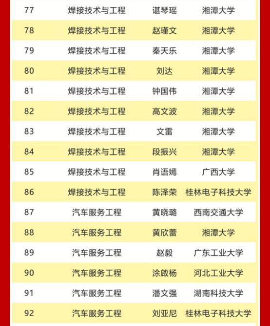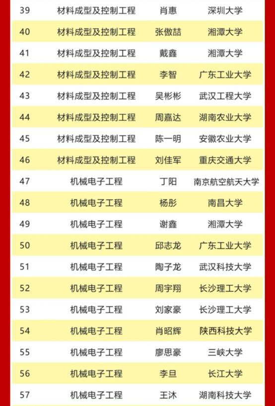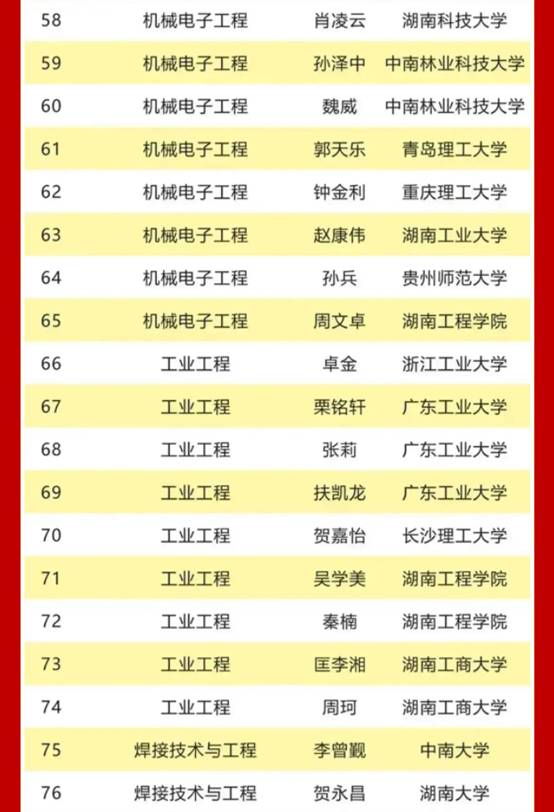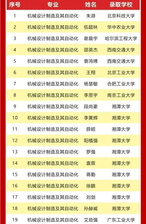 机械工程学院2023届毕业生锐意进取,奋勇争先,取得优异的考研成绩,共计92名同学考研成功上岸,被中南大学、湖南大学、南京航空航天大学、华中农业大学、西南交通大学、湘潭大学、广西大学、贵州大学等国内双一流建设高校录取,考研录取人数较去年增加13人,考研录取率再创新高,达到16.03%。