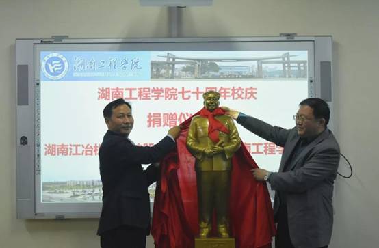 江冶科技公司总经理范伟校友为学校近年来取得的成绩感到自豪,为学校给他们搭建的人才招聘平台表示感激。他表示学校是学生成长成才的摇篮,自己有现在的成就离不开母校的栽培,期待在今后的人才输送和技术交流方面与母校有更深层次合作。随即向学校捐赠毛泽东铜像一座。