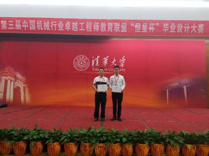 5月24-25日,第三届中国机械行业卓越工程师教育联盟“恒星杯”毕业设计大赛决赛在清华大学举行,比赛由教育部高等学校机械类专业教学指导委员会、中国机械工程学会、中国机械行业卓越工程师教育联盟共同主办,清华大学和北京精雕集团共同承办,来自清华大学、浙江大学、大连理工大学等64所高校的171项毕业设计课题被评选进入全国决赛,由我校机械工程学院陈国强老师指导的材料成型1591班陈春波同学成功入围全国决赛,最终获得佳作奖,陈国强老师荣获优秀指导教师奖,这是我校第二次在此项比赛中荣获佳绩。