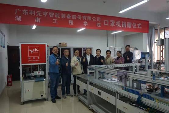 吴玉祥为学校给利元亨搭建的人才招聘平台表示感激,对学校务实、创新、开拓的校风给予充分肯定。目前已有多名校友成为公司的技术骨干,期待后续有更多的湖工学子加入。他表示,利元亨是一支团结有战斗力的有强烈社会责任感的年轻团队,在2020年新冠疫情最严重时期,项目团队加班加点,仅用一周时间就成功开发了全自动智能口罩生产线,三个月时间完成了几百台设备的交付,为抗击疫情肩负了应尽的社会责任。此次捐赠全自动平面口罩智能生产线,希望能助力实验室建设,进一步提高学生的动手能力,同时将这种有责任有担当的企业文化精神传递给学生。智能口罩生产线目前已安放于学院实验室,待调试完成后将投入实验教学和专业实训。