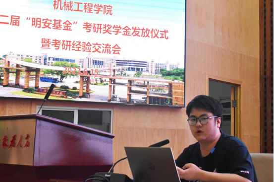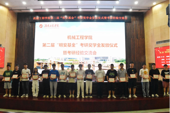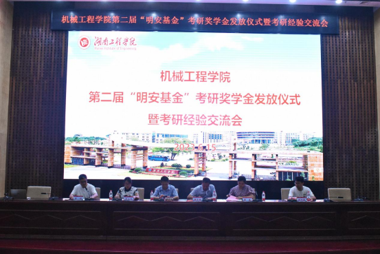 6月15日下午,机械工程学院在图书馆第一报告厅举办第二届“明安基金”考研奖学金发放仪式暨考研经验交流会。湖南工程学院党委委员、副校长魏克湘,机械工程学院院长陈国强、党委书记覃波、副院长程玉兰、邹鸿翔,获奖学生以及20、21级学生近200人参加活动,学院党委副书记肖彬主持颁奖典礼。