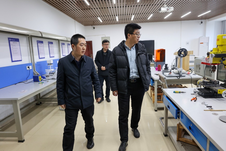 李新华一行在机械工程学院党委书记陈国强的陪同下,参观了学校校史馆、风电技术创新研究院和新能源汽车创新研究院成果展厅、机械工程学院智能制造实验室以及大学生实践创新基地进行了参观考察,进一步了解了我校的办学历史、办学特色和优势。