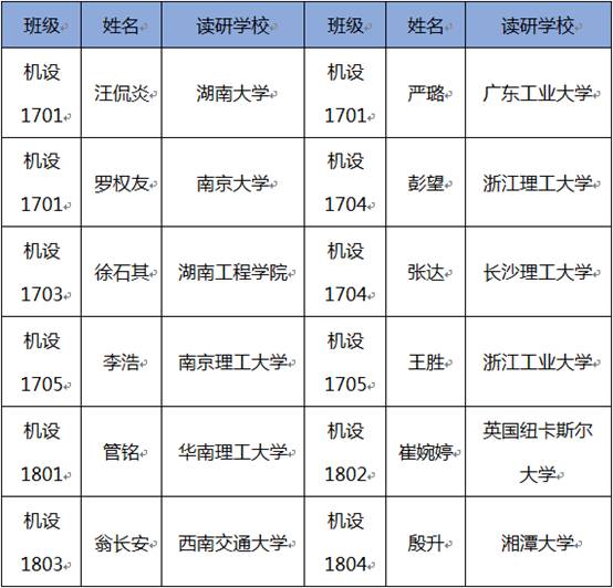 本专业学生考研平均录取率达到15%左右,考取学校包括南京大学、湖南大学、华南理工大学、西南交通大学、英国纽卡斯尔大学等国内外知名院校。