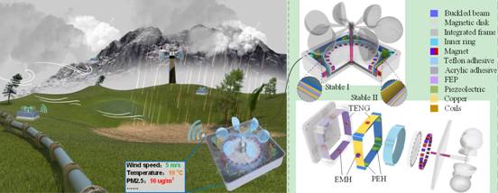 团队积极响应双碳战略目标,以科技创新推动能源转型,针对物联网时代新能源结构变化,开展复杂环境能量采集技术及其自供能应用研究。白泉博士等提出了用于俘获环境能量的基于磁力耦合双稳态突跳机制的复合能量采集器,通过采用磁力耦合非接触能量传递机制,驱动部分和机电转换部分易于物理隔离,提高了系统在恶劣环境下的鲁棒性。其中一篇厘清了双稳态突跳机制、摩擦纳米边界调控机制与压电梁大变形的关系,设计了突跳摩擦发电-压电协同复合旋转能量采集器,能量密度提高了2.65倍和转速范围扩大了1.5倍。另一篇提出了突跳摩擦发电-压电-电磁复合风能采集方法,通过调控双稳态突跳运动,提高了机电能量转换效率及风能采集器输出性能,实现了自供能环境监测(温度、风速)和无线信息传输。这为基础设施的自供电环境监测和状态监测提供了一个切实可行的解决方案。