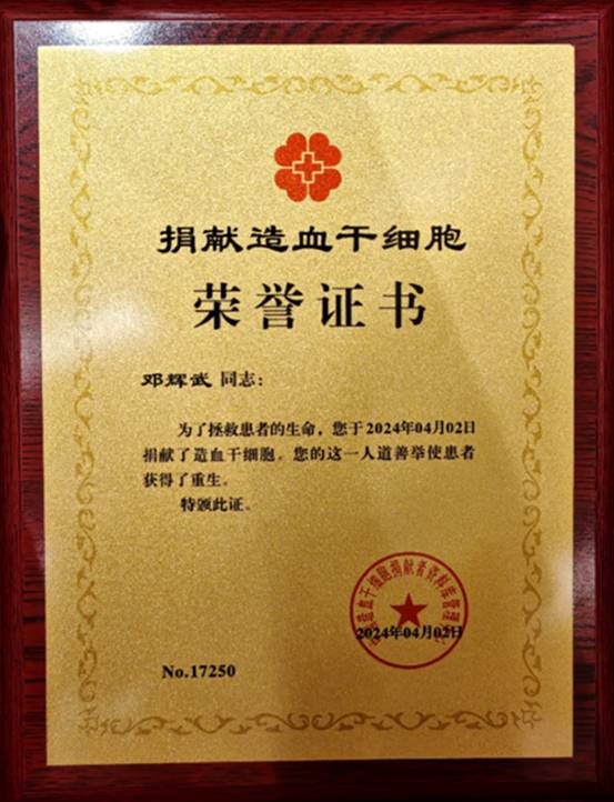 “我愿意!”是邓辉武被询问是否愿意给匹配成功的患者捐赠造血干细胞时的响亮回答。今年2月1日,邓辉武接到湖南省红十字会工作人员的电话,被告知一求助血液病重症患者经数据库检索,HLA分型资料与他初配相合,他毫不犹豫同意履行捐献意愿。
